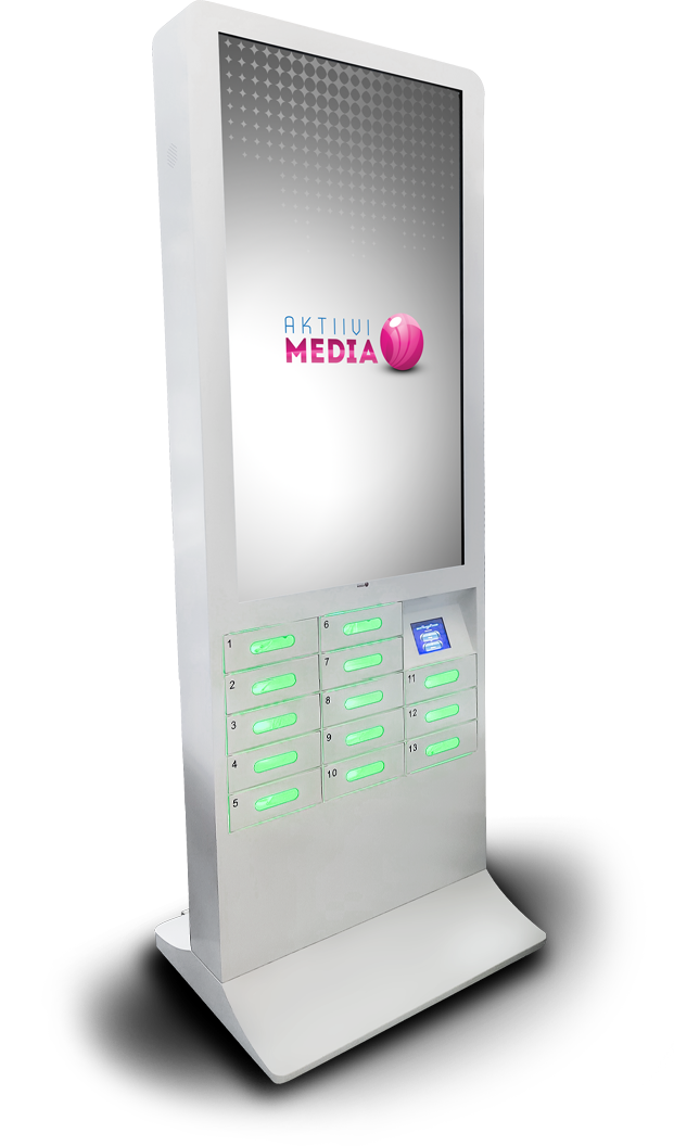 käsidesilaitteista sekä näytöllisistä kännykän latauspisteistä.